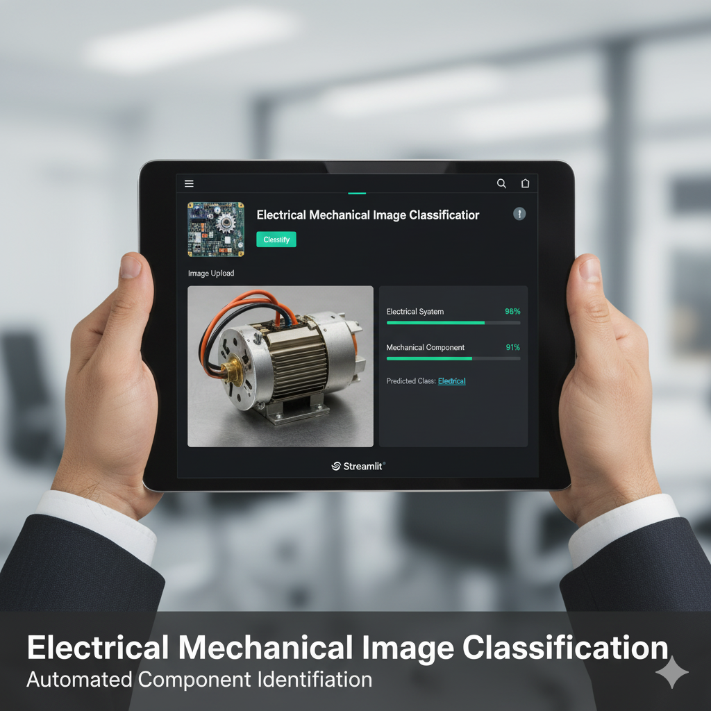 This project implemented an end-to-end Deep Learning Image Classification pipeline using a CNN-ANN model to accurately classify 7 categories of industrial electrical and mechanical components from a custom 3500+ image dataset, complete with a deployed Streamlit application for real-time inference.